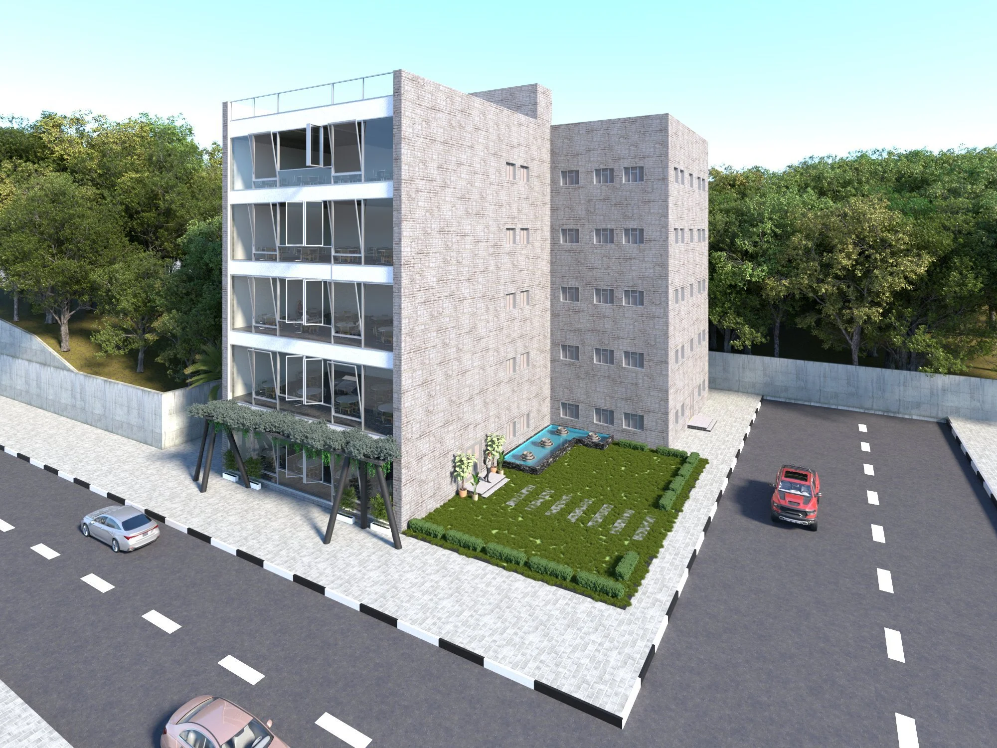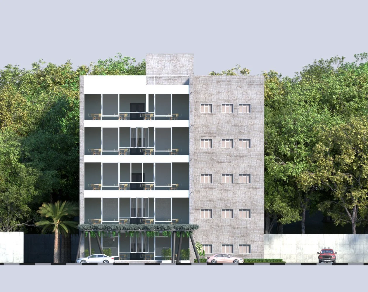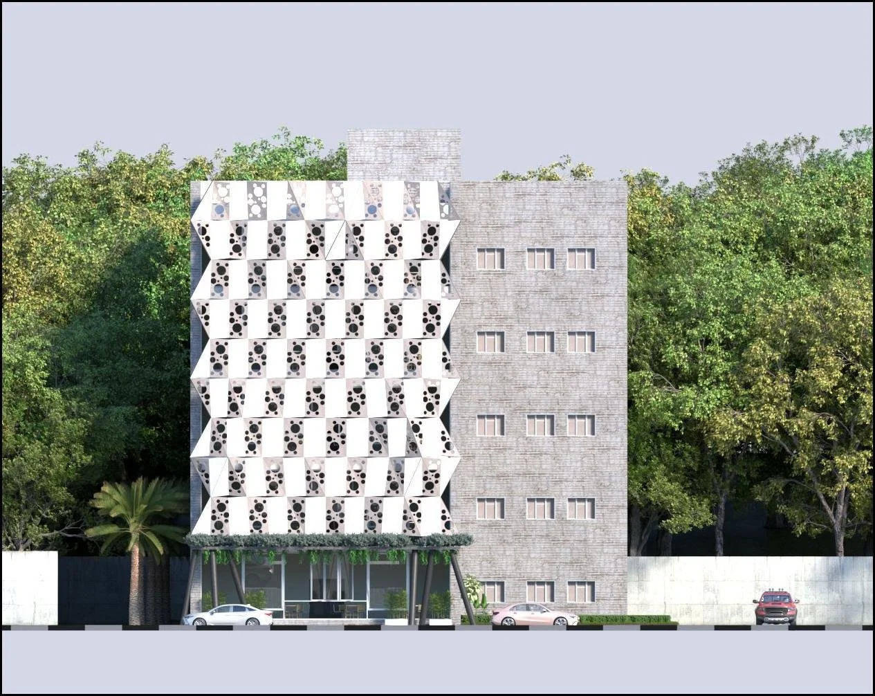 The facade design is breathable and allow air circulation through the three different types of curtain panels used the sliding, awing, and fixed windows